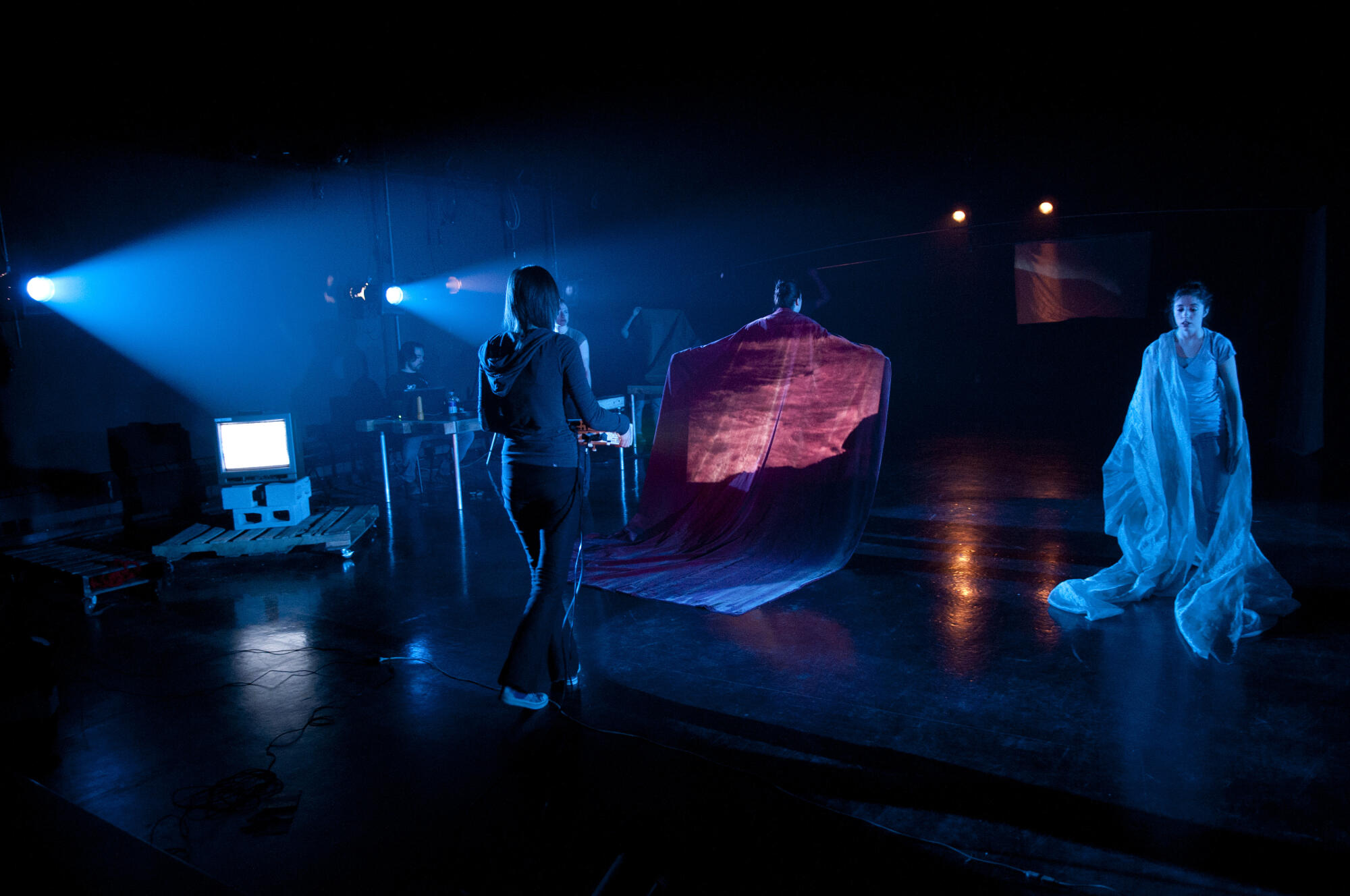 Toutes ces strates d’écritures scéniques s’inscrivent dans une scénographie délicate, mobile et encore ronde. Une « fragilité solide » qui organise le mouvement général du côté de l’air, l’eau et du tactile. Enfin, pour porter ce corps scénique, j’avais le désir de voir les acteurs « marcher dans la couleur » (Didi-Huberman, 2001) et de jouer dans une lumière pleine et franche.